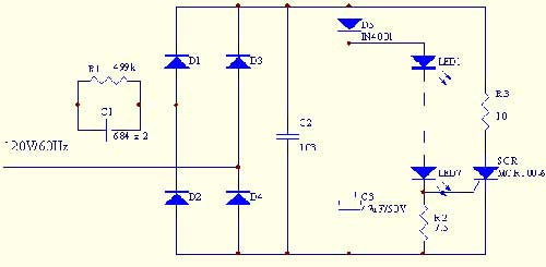 在圖二電路中﹐可控硅SCR及R3組成保護(hù)電路﹐當(dāng)流過(guò)LED的電流大于設(shè)定值時(shí)﹐SCR導(dǎo)通一定的角度﹐從而對(duì)電路電流進(jìn)行分流﹐使LED工作于恒流狀態(tài)﹐從而避免LED因瞬間高壓而損壞。