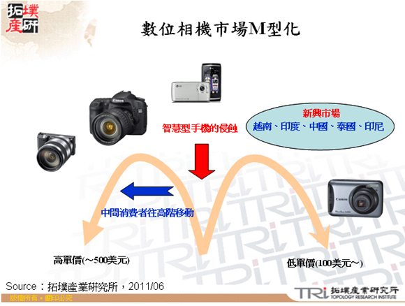 據(jù)拓墣研究所,受到消費(fèi)族群往高端相機(jī)產(chǎn)品移動(dòng),以及新興市場(chǎng)所帶動(dòng)的低端消費(fèi)型相機(jī)銷售量,造成數(shù)碼相機(jī)市場(chǎng)兩端銷售狀況高起,市場(chǎng)呈現(xiàn)M型化的現(xiàn)象,2011下半年數(shù)碼相機(jī)的銷售量將會(huì)成長(zhǎng)到7,900萬(wàn)臺(tái)。
