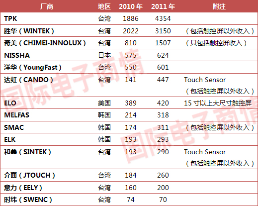 據(jù)水清木華研究中心最新報告,經(jīng)歷了2010年的爆發(fā)后,觸控屏行業(yè)開始呈現(xiàn)兩極分化。大廠家的收入飛速增加,而小廠家收入微幅增長甚至衰退。TPK和勝華兩大巨頭占據(jù)了行業(yè)的高端位置,以技術(shù)優(yōu)勢和客戶優(yōu)勢牢牢地占據(jù)了市場的大部分份額。雖然觸控屏整體市場在2011年繼續(xù)高速增長,但中小廠家卻很難從中獲益。2010年市場大好,使得不少企業(yè)都擴(kuò)大了產(chǎn)能,這樣不僅是電阻觸控屏出現(xiàn)激烈的殺價競爭,電容觸控屏也出現(xiàn)殺價競爭。