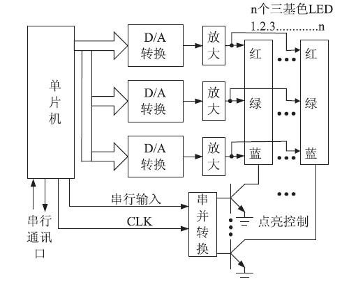 如圖2 中,87LPC762 單片機(jī)傳送數(shù)據(jù)到三路D /A 轉(zhuǎn)換器,將數(shù)字量轉(zhuǎn)換為模擬量,經(jīng)功率放大電路分別控制紅、綠、藍(lán)三色LED 發(fā)光的強(qiáng)度,從而控制LED 發(fā)光的顏色以及亮度, 對于多個LED采用動態(tài)掃描的方式,由單片機(jī)控制兩個輸出端子以CLK 為基準(zhǔn)輸出串行信號,經(jīng)串并轉(zhuǎn)換器件控制處于開關(guān)工作的三極管分別對三基色LED 進(jìn)行點亮,完成對圖形圖案的控制。最后,此系統(tǒng)即可完成調(diào)光所需的各項功能。串行通訊接口采用RS232標(biāo)準(zhǔn)總線與計算機(jī)連接,可將計算機(jī)中需要顯示的圖案或文字傳送到本系統(tǒng)并顯示出來。