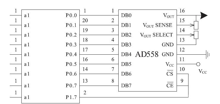 圖3 中AD558 是D /A 轉(zhuǎn)換芯片,能將數(shù)字量轉(zhuǎn)換為模擬量。單片機(jī)通過P0 口與AD558 的DB0 -DB7 連接,進(jìn)行并行數(shù)據(jù)傳輸,以此控制AD558 輸出電壓的高低,輸出電壓通過功率放大控制LED 單色發(fā)光的強(qiáng)度。由于AD558 是8 位的D /A 轉(zhuǎn)換芯片,因此通過三路D /A 分別控制三基色時,其可將三基色中的紅、綠、藍(lán)分別分為28 = 256 份輸出,若將三基色任意組合即可最大形成2563 = 16777216 顏色和亮度的組合分辨率,通過軟件數(shù)據(jù)的設(shè)定可根據(jù)實際需要設(shè)置最大限度內(nèi)任意所需要的分辨率值。