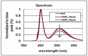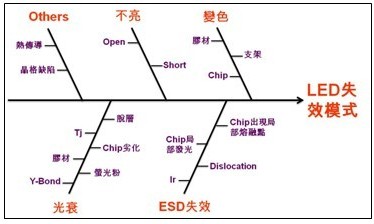 5. 其他:突然間的失效常常是因為熱應力所致,當環(huán)氧樹脂的封裝達到玻璃轉移溫度(Tg)時,樹脂會很快速的膨脹,在半導體和焊點接觸的位置產生機械應力來弱化或扯斷它,而在非常低的溫度時則會讓封裝產生裂痕。 此外,高功率LED對電流的擁擠敏感,不均勻的電流密度分布在接合點(junction)上,可能會產生局部的熱點,存在熱燒毀的風險,若再出現基板的熱傳不均勻,將使問題變得更嚴重,這常見于銲接材料的孔洞或是電子遷移效應和Kirkendall空洞,故熱燒毀亦是LED常見的失效模式。