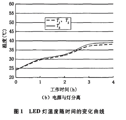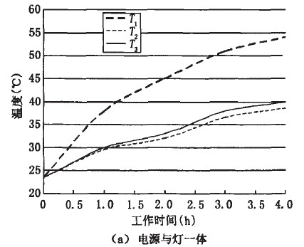 由于電源本身產(chǎn)生一定的熱量,使得LED燈上的熱量來源增加。同時,電源與燈一體設(shè)計使得LED燈整體受熱不均,這些因素都會導(dǎo)致燈具發(fā)生疲勞和早期失效,而影響其壽命。圖1為LED燈溫度隨工作時間的變化曲線,圖中T1為放置電源處溫度,T2為遠離電源處溫度,T3為燈體中心溫度。從圖中看出,隨著工作時間的增加,圖1(a)中T1遠大于T2和T3;圖1(b)中T1與T2兩曲線重合,T3略大于T1和T2??梢姺蛛x電源后,整燈的溫度分布很均勻。