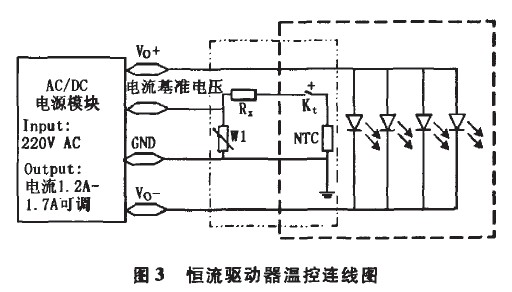 圖3為恒流電源給LED燈供電控制原理圖。電源的指標為:220V AC輸入,電流1.2一1.7A可調(diào),電壓自適應(yīng)(36~39V)。圖3中左側(cè)細虛線框中部分為控制電路,其中W1為可調(diào)電阻器;NTC為負溫度系數(shù)熱敏電阻;Kt為常開溫度繼電器,其閉合溫度為56℃,自動斷開溫度為45℃;Rx為匹配電阻。圖3右側(cè)粗虛線框中部分為LED模塊部分。溫度繼電器和熱敏電阻安裝在LED模塊上,并與模塊緊密接觸,以便將LED的溫度信息反饋給控制電路。常溫下Kt