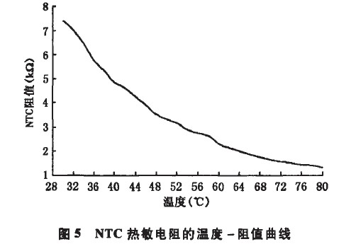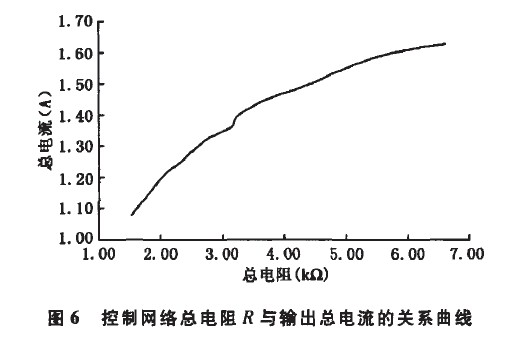控制電路阻值與輸出總電流的關(guān)系列于表1,其中R為控制電路的等效電阻。經(jīng)過在恒溫箱中測試,每2℃記錄1組數(shù)據(jù)得到如圖5所示的NTC熱敏電阻的溫度一阻值曲線。該方案中,驅(qū)動電源通過接收到反饋的溫度信息來控制輸出電流,根據(jù)圖5中NTC的溫度與阻值的關(guān)系,只要找到輸出電流隨總阻值的變化關(guān)系(如圖6所示),再進行適當?shù)碾娮杵ヅ?,便可找到溫度與驅(qū)動器輸出電流的關(guān)系。