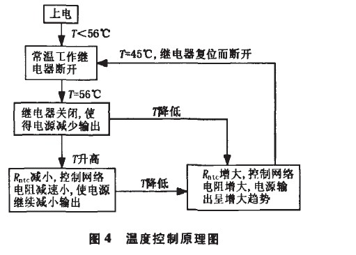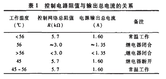 處于斷開狀態(tài),此時控制電路中只有W1起控制作用,設(shè)定常溫工作總電流恒定為1.60A。當繼電器溫度上升到56℃時,Kt自動閉合,整個控制電路開始工作,以減小恒流電源的輸出;當溫度降低到45℃時,Kt自動斷開,電源額定輸出。該過程可用圖4表示,圖中T為Kt的溫度,Rntc為NTC的阻值。