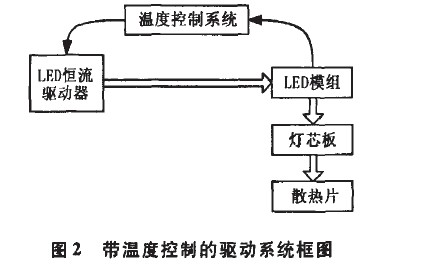 此方案通過控制驅(qū)動器的輸出電流來實現(xiàn)對LED燈的溫度控制。圖2為恒流驅(qū)動器驅(qū)動LED燈框圖,驅(qū)動器輸出到LED模組,LED模組上產(chǎn)生的熱量通過良好的導(dǎo)熱材料傳導(dǎo)到燈芯板,最后經(jīng)由散熱片散熱到大氣中。當外界散熱環(huán)境惡劣時,LED模組的溫度會達到溫度控制系統(tǒng)設(shè)定的溫度,得到反饋的信息后,驅(qū)動器減少輸出,達到限制并降低LED模組溫度的目的。