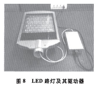 自動斷開,整個控制電路工作,從而減少恒壓電源的輸出,當溫度降低到48℃時,溫度繼電器自動閉合,并使電源正常輸出。經(jīng)過測試,得出驅(qū)動器Vo端與Trim端之間連接的總電阻值尺與驅(qū)動器輸出電壓Uo之間的關(guān)系,見表2。可以看出:隨著電阻的增加,輸出電壓呈減小趨勢。當溫度達到60℃時,圖7控制電路中溫度繼電器Kt斷開,此時,只要電阻匹配得當,我們便可以得到設(shè)定的輸出電壓。各阻值計算方法同上,在此不作具體計算。3試制驅(qū)動器實測結(jié)果本項研究進行了大功率LED路燈和LED投射燈及驅(qū)動器的研制工作。圖8為LED路燈樣燈及其恒流驅(qū)動器,燈體采用一體化設(shè)計,測得常溫輸入驅(qū)動器的交流電流為270mA,燈長時間運行狀況良好,其總光通量為3 408 lm,在控溫作用時,輸出電流減小為常溫的87%。圖9為LED投射燈樣燈及其恒壓驅(qū)動器,測得常溫下輸入驅(qū)動器的交流電流為140mA,總光通量為1 011 lm,在控溫作用時,電壓減小為常溫的90%。