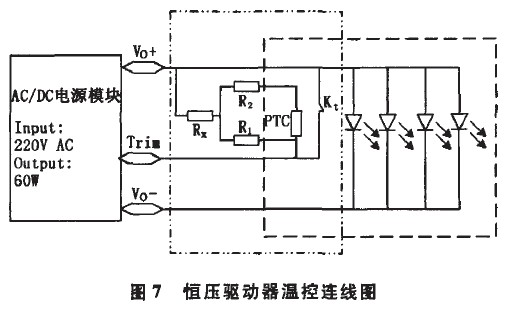 圖7為恒壓驅(qū)動器溫控的連線圖。Trim端用來調(diào)節(jié)電源的輸出。左側(cè)點線型虛線框中部分為控制電路,其中:PTC為正溫度系數(shù)溫敏電阻;R1、R2、R,均為普通電阻,與PTC溫敏電阻匹配調(diào)節(jié)驅(qū)動器輸出電壓;Kt為常閉型溫度繼電器,其斷開溫度為60℃,自動閉合溫度為48%。右側(cè)虛線框中部分為LED模塊部分。Kt和PTC安裝在LED模塊上,并與模塊緊密接觸。常溫下Kt處于閉合狀態(tài),此時控制電路中控制驅(qū)動器額定輸出,該LED模組常溫工作額定總電壓為24V。當繼電器溫度上升到60℃時Kt