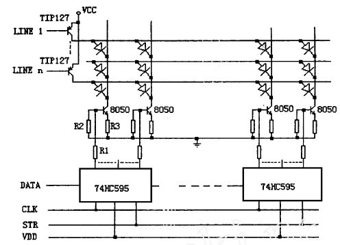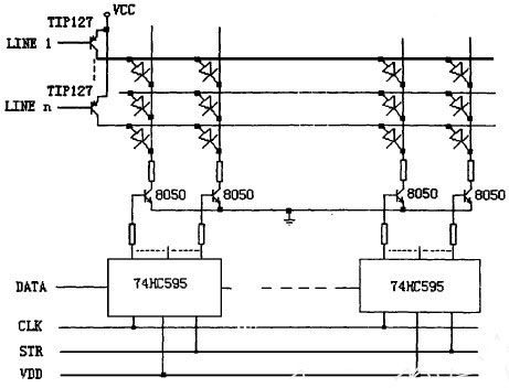 常規(guī)型驅(qū)動電路的設(shè)計一般是用串入并出的通用集成電路芯片如74HC595或MC14094 等作為列數(shù)據(jù)鎖存,以8050 等小功率NPN 三極管為列驅(qū)動,而以達林頓三極管TIP127等作為行掃描管,其電路如圖1 所示。