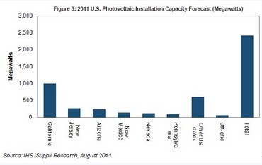 據(jù)IHS iSuppli公司的光伏市場研究報告,2011年美國光伏(PV)安裝容量將大增166%,總體安裝容量將達到2.4GW,加州將一馬當先。
