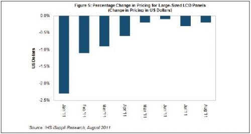 據(jù)IHS iSuppli公司的液晶顯示器(LCD)價(jià)格研究報(bào)告,8月份大尺寸LCD面板價(jià)格下降速度預(yù)計(jì)略慢于7月,供應(yīng)商積極降低產(chǎn)能利用率預(yù)計(jì)會防止面板價(jià)格進(jìn)一步下滑。
