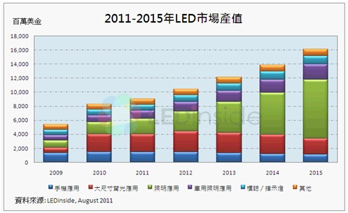 集邦科技旗下研究部門LEDinside近期發(fā)表的研究報告顯示,2011年的全球高亮度LED產(chǎn)值預估由2011年初106億美元下修至90億美元(年增率僅8%)。主要原因在于背光市場不如預期,加上LED的平均售價快速下滑導致LED產(chǎn)業(yè)供過于求。