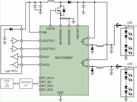 安森美半導(dǎo)體針對(duì)LED汽車(chē)前照燈系統(tǒng)開(kāi)發(fā)了NCV78663電源鎮(zhèn)流器及雙LED驅(qū)動(dòng)器。NCV78663是先進(jìn)的高可靠性、高能效的系統(tǒng)級(jí)芯片(SoC) LED驅(qū)動(dòng)器,支持達(dá)2 A電流,提供高于90%的總能效,驅(qū)動(dòng)高達(dá)60 V電壓的多串LED,能以PWM調(diào)光維持色溫及控制平均電流,使設(shè)計(jì)人員能夠以一顆高集成度的SoC控制遠(yuǎn)光燈及近光燈、日間行車(chē)燈、轉(zhuǎn)向指示燈及霧燈,所需外部元件極少。這器件通過(guò)SPI接口與外部微控制器通信,在上電后動(dòng)態(tài)地控制系統(tǒng)參數(shù)、檢測(cè)LED工作狀態(tài)并反饋診斷信息。圖4顯示的是NCV78663在先進(jìn)的汽車(chē)前照燈應(yīng)用中的電路圖。
