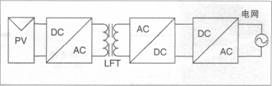 工頻隔離并網(wǎng)逆變器(如圖3)具有電氣隔離、消除電流直流分量等優(yōu)點(diǎn),但體積重量大、價(jià)格高,只有94%—96%的系統(tǒng)效率。