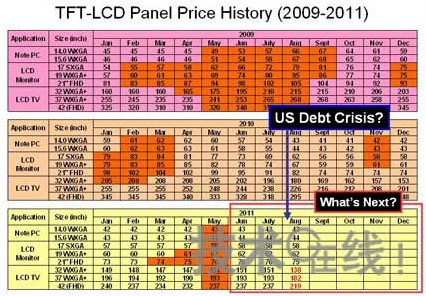 日本高級數(shù)據(jù)研究機(jī)構(gòu)首席執(zhí)行官高多清作就持這種觀點(diǎn)。2008年美國金融危機(jī)時(shí),他對TFT-LCD面板價(jià)格做出了下降走勢的準(zhǔn)確判斷,因此,他對預(yù)計(jì)本次美國債務(wù)危機(jī)期間的TFT-LCD面板價(jià)格仍會繼續(xù)走低非常自信(見圖1)。