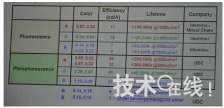 圖5 RGB OLED的螢光和磷光材料的壽命比較