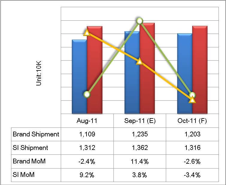 根據(jù)集邦科技(TrendForce)旗下研究部門WitsView全球前十大液晶監(jiān)視器出貨調(diào)查顯示,前十大品牌廠商2011年8月在美系廠商因季初而導(dǎo)致出貨動能疲軟,加上終端消費市場需求依然平淡下影響下,MoM下滑至2.4%,為1,109萬臺。一如WitsView預(yù)期,8月份SI陸續(xù)接獲第四季品牌短單及部分SI出貨從谷底攀升下,呈現(xiàn)較高幅度之月成長,達9.2%。展望SI第四季出貨,WitsView表示由于2012中國農(nóng)歷年在一月下旬較往年為早,為因應(yīng)中國新年假期而引起的缺工問題,部分第一季需求將提前在第四季反應(yīng),QoQ出貨將呈現(xiàn)小幅成長。展望品牌九月出貨,除了季底需沖刺出貨量及部分區(qū)域的教育市場訂單釋出外,品牌廠商亦摩拳擦掌為中國十一長假銷售準(zhǔn)備,因此WitsView預(yù)估九月將有9-12%出貨成長空間。