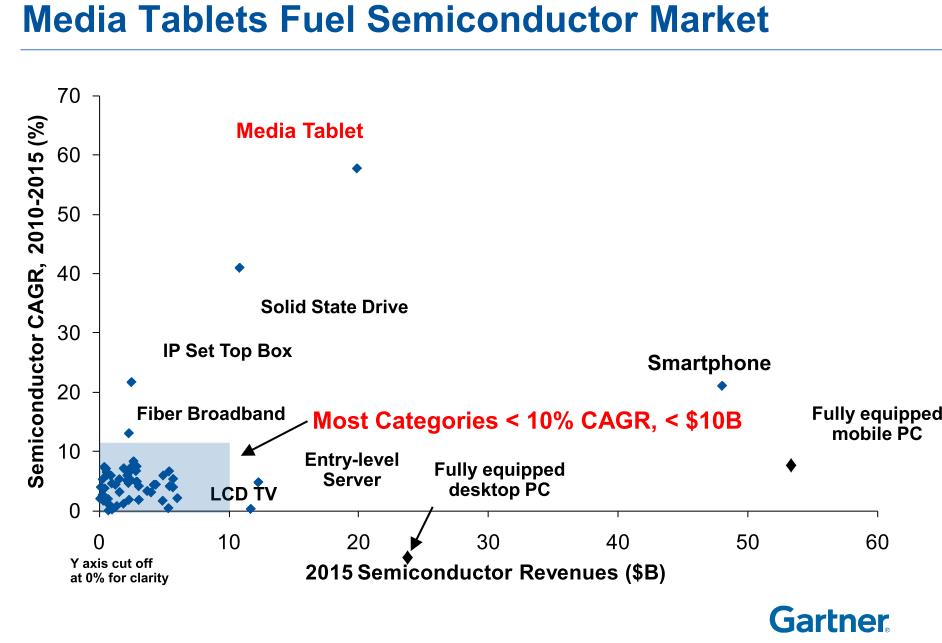 Gartner研究總監(jiān)王端分析,今年P(guān)C半導(dǎo)體的營收減少了82億美元,但在智能型手機應(yīng)用成長62億美元、功能手機應(yīng)用跌20億美元和平板裝置半導(dǎo)體營收成長40億美元,幾乎回補了在PC部門下跌的幅度,所以去年跟今年幾乎持平。