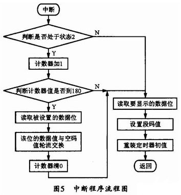 在狀態(tài)2下,參數(shù)設(shè)定時(shí),設(shè)定位要實(shí)現(xiàn)閃爍,以確定正在被設(shè)置的數(shù)據(jù)位。實(shí)現(xiàn)閃爍的基本思想是每隔500 ms,當(dāng)前閃爍數(shù)據(jù)位的段碼值就由數(shù)據(jù)狀態(tài)變?yōu)榭沾a狀態(tài),下一個(gè)500 ms再由空碼狀態(tài)變?yōu)閿?shù)據(jù)狀態(tài),并不斷循環(huán)執(zhí)行此操作(共陽(yáng)極顯示方式下空碼值為0XFF)。這樣,從用戶角度看,當(dāng)前被設(shè)定的數(shù)據(jù)位就是閃爍的。這里可通過(guò)設(shè)定一個(gè)計(jì)數(shù)器來(lái)確定轉(zhuǎn)換時(shí)間,當(dāng)計(jì)數(shù)值達(dá)到500/2.78(約為180)時(shí),當(dāng)前閃爍數(shù)據(jù)位就進(jìn)行段碼值轉(zhuǎn)換。本系統(tǒng)的中斷程序流程圖如圖5所示。