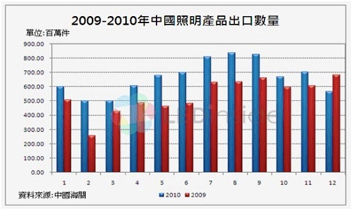 集邦科技旗下研究部門 LEDinside 研究指出,中國目前已成為照明燈具產(chǎn)品的制造大國,將近70%的照明產(chǎn)品都是由中國地區(qū)所生產(chǎn),以白熾燈來說更是如此。LEDinside調查指出,2010年白熾燈、鹵鎢燈、(緊湊型熱陰極)螢光燈與其他燈具的每月平均出口數(shù)量達6.67億件,金額達11.40億美元;總計2010年出口數(shù)量達79.9億件且金額達136.77億美元,相較於2009年,數(shù)量成長24.2%,且金額成長34.7%。
