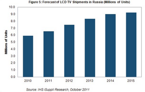 據(jù)IHS iSuppli公司的電視研究報告,隨著青睞先進(jìn)電視技術(shù)的中產(chǎn)階級不斷壯大,今年俄羅斯液晶電視出貨量預(yù)計(jì)強(qiáng)勁增長10%。俄羅斯屬于所謂的金磚國家(BRIC),是一個重要市場。