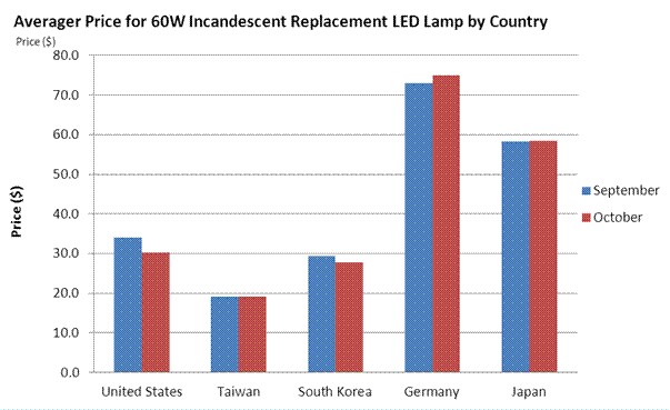 - 10月替代60瓦白熾燈的LED燈泡全球平均售價(jià)為36美元
