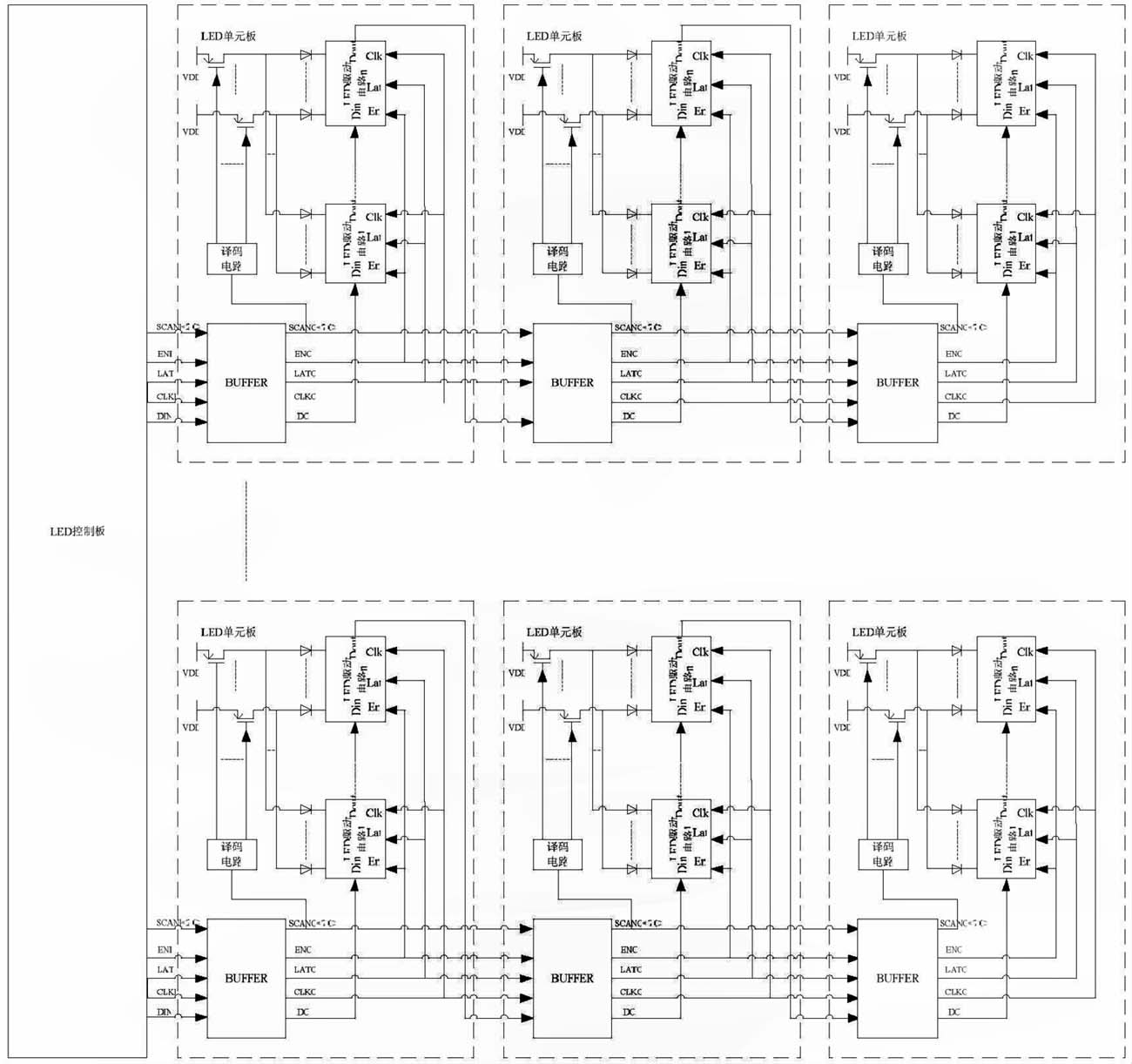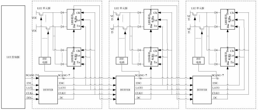 LED 控制板與LED 單元板構(gòu)成的LED 顯示系統(tǒng)的主體,如圖1 所示。其中,LED 單元板包括了增強信號驅(qū)動能力的BUFFER 電路、產(chǎn)生動態(tài)顯示掃描時序的譯碼電路、若干個開關管和若干個LED 驅(qū)動電路。其通信過程為:LED 控制板發(fā)出的通信信號依次經(jīng)過各串接的LED 單元板的BUFFER 電路進行驅(qū)動增強;各LED 單元板中經(jīng)BUFFER 電路增強后的掃描信號(SCANO)提供給本LED 單元板的譯碼電路,譯碼電路譯碼產(chǎn)生動態(tài)顯示掃描時序控制開關管;各LED 單元板中經(jīng)BUFFER 電路增強后的使能信號(ENO)、鎖存信號(LATO)、時鐘信號(CLKO)分別提供給本LED 單元板中所有LED 驅(qū)動電路。