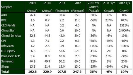 中國大陸的新進(jìn)面板廠商京東方、華星光電與中電熊貓等也都在2012年隨著其大世代線的量產(chǎn)設(shè)下了相當(dāng)積極的出貨目標(biāo);而一些生產(chǎn)較小尺寸液晶電視面板的廠商如華映與龍騰等則會在2012年逐步退出電視面板市場。