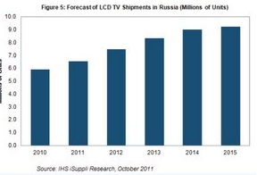 據(jù)IHS iSuppli公司的電視研究報(bào)告,隨著青睞先進(jìn)電視技術(shù)的中產(chǎn)階級(jí)不斷壯大,今年俄羅斯液晶電視出貨量預(yù)計(jì)強(qiáng)勁增長(zhǎng)10%。俄羅斯屬于所謂的金磚國(guó)家(BRIC),是一個(gè)重要市場(chǎng)。