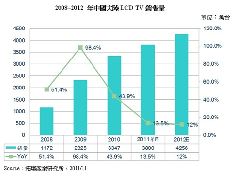 - 2011年中國大陸LCD TV年銷售量預(yù)估將成長13.5%