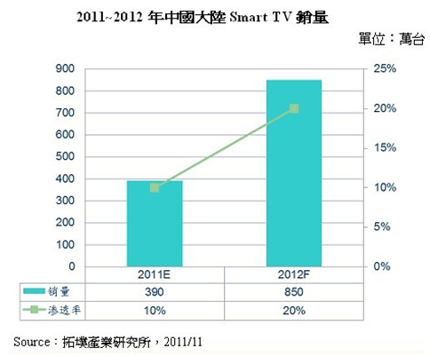 - 2012年中國大陸Smart TV銷售量將達(dá)850萬臺(tái)