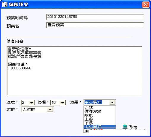 ★ 文本顯示方式有左移,下移,畫卷展開等多種效果,速度30級(jí)可調(diào)、停頓時(shí)間50級(jí)可調(diào)。