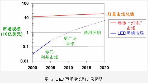 高亮度LED的光輸出、能效及成本正在迅速改善,使其應用范圍不斷擴大。根據(jù)LED的工作電壓可以劃分為三個功率等級:0.9V至7V(手機和移動設備)、7V至60V(汽車和LCD背光)和60V至700V(通用照明)。這當中市場成長潛力最大的是汽車、LCD背光和通用照明。汽車應用主要包括氖燈替代、應急車輛燈、組合尾燈、儀表盤照明、信息娛樂、內(nèi)部照明、中央高位剎車燈、前照燈、停車燈等;LCD背光主要包括大屏幕液晶電視、中等屏幕的筆記本、GPS、相框、上網(wǎng)本等;通用照明主要有離線LED驅動器/鎮(zhèn)流器、街道/區(qū)域照明、替代燈泡、替代熒光燈、交通信號燈、工作照明、景觀照明、建筑物照明等。不難看出,今后LED照明將逐步進入到更多的應用領域。