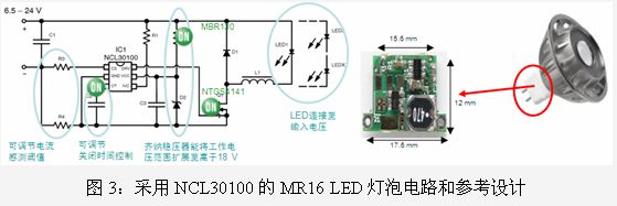 還有一款MR16 LED方案是用于降壓型應用的NCL30100,它是能效大于95%的LED驅動器控制器,開關頻率高達700kHz,不需要輸出電容,Vcc工作范圍從6.35至18 V,可以驅動一個或多個大功率LED,主要用在MR16 LED照明、環(huán)境燈照明、太陽能LED、交通照明、室外照明和LED光條等應用。其PCB非常小巧,可以裝入MR16燈的燈座內(nèi)。NCL30160的遲滯控制特性可在負載瞬期間提供快速的回應,無需小型信號控制環(huán)路補償元件。保護特性包括可利用電阻設定LED電流、LED短路保護、欠壓鎖定及熱關閉。