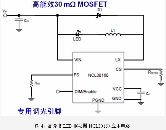 NCL30160是安森美半導體為驅動大功率LED新推出的一款NFET遲滯降壓、恒流驅動器。它是新一代高能效的解決方案,電流提升到了1.5安培,損耗非常低,體積也更小,可最大限度地減少空間和成本。它通過利用僅55mΩ的低導通阻抗內(nèi)部MOSFET及以100%占空比工作的能力,能夠提供能效高達98%的方案。最高1.4MHz的高開關頻率使設計人員可采用更小的外部元件,將電路板尺寸減至最小及成本降至最低。