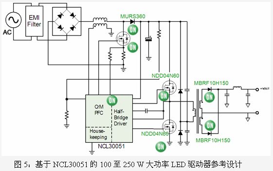 另一款專用LED電源集成電路是NCL30051,能夠為降壓直流-直流(DC-DC)轉換器/LED驅動器提供恒定電壓。該器件集成了一個臨界導電模式(CrM) PFC控制器及一個半橋諧振控制器,并內(nèi)置600V驅動器,針對離線電源應用進行了優(yōu)化,具備了所有實現(xiàn)高能效、小外形因數(shù)設計所需的特性。