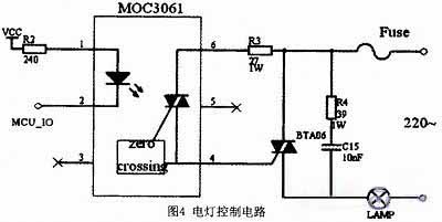 本系統(tǒng)由光電傳感器檢測(cè)洗手間內(nèi)是否有人,單片機(jī)進(jìn)行計(jì)數(shù),當(dāng)N不為零時(shí),單片機(jī)會(huì)向與MOC3061芯片引腳相連的端口輸送信號(hào),然后通過可控硅來控制燈的開、關(guān)。其中R3是雙向可控硅的門極電阻,當(dāng)可控硅靈敏度較高時(shí),門極阻抗也很高,并上R3可提高抗干擾能力。 39Ω電阻和0.01μF電容組成浪涌吸收電路,防止浪涌電壓損壞雙向可控硅。其電路圖如圖4所示。