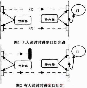 本設(shè)計(jì)的改進(jìn)之處是設(shè)計(jì)一個(gè)具有計(jì)數(shù)功能的模塊,我們可以使用對(duì)射型光電傳感器,如圖1所示在洗手間的進(jìn)口處設(shè)置兩個(gè)發(fā)射源和兩個(gè)接收源,當(dāng)有人進(jìn)或者出洗手問的門時(shí),會(huì)阻擋光線,如圖2所示,接收處就接收不到設(shè)置光源發(fā)出的光信號(hào),這時(shí)接收處的輸出端會(huì)發(fā)出一個(gè)信號(hào),計(jì)數(shù)器就可以通過此信號(hào)進(jìn)行計(jì)數(shù)。只要計(jì)數(shù)器里存儲(chǔ)數(shù)等于一時(shí),系統(tǒng)控制燈亮,大于零時(shí),該系統(tǒng)就會(huì)控制燈一直亮著,一旦為零,系統(tǒng)會(huì)控制燈延時(shí)一小段時(shí)間后自動(dòng)熄滅。由于整個(gè)系統(tǒng)初啟動(dòng)時(shí)無法判斷室內(nèi)是否有人,因而我們還會(huì)設(shè)置一個(gè)簡(jiǎn)易開關(guān),供使用者進(jìn)行手控,且為方便使用者能在夜間看到開關(guān)的位置,我們可以采用表面具有夜光性能的材料來做按鍵。光電檢測(cè)系統(tǒng)的啟動(dòng)由光敏傳感器控制。