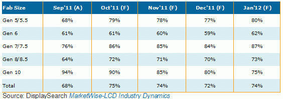 表一、Sep’11-Jan’12全球TFT-LCD面板各世代線產能利用率