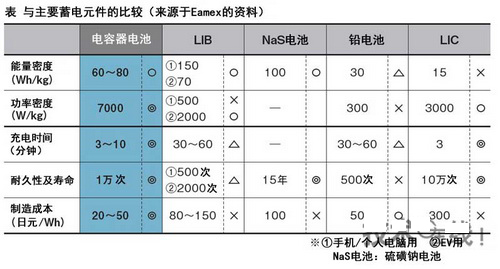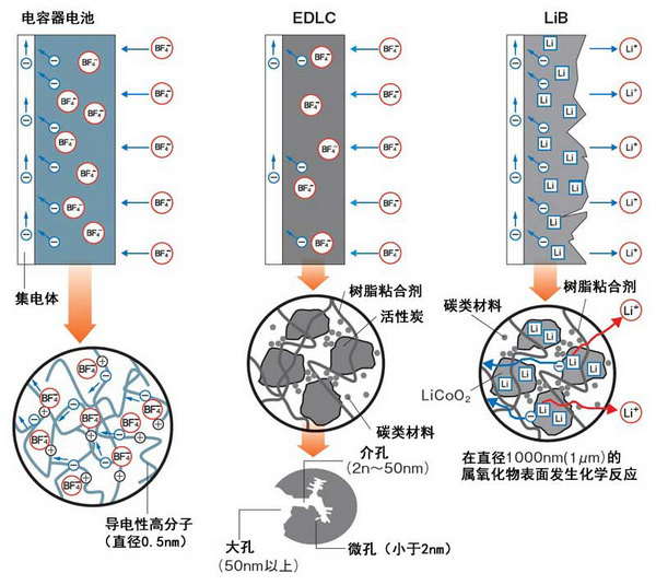 LIB的電子隨著正極中鋰金屬氧化物的化學(xué)反應(yīng)而移動(dòng),因此充放電需要一定時(shí)間。而電容器電池或LIC是隨著離子的移動(dòng)來(lái)交換電子的,因此反應(yīng)很快。因而可實(shí)現(xiàn)幾分鐘~10分鐘左右的高速充放電。