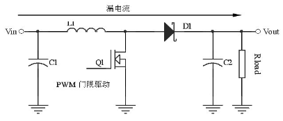 (1)電池使用壽命短:圖2 中,即使關(guān)斷升壓轉(zhuǎn)換器主開關(guān),Vin 與Vout 之間仍會形成一條電流泄露路徑,如果在輸出端接有任何負載,其中泄露電流Ileak 接近于Vin/Rload,那么漏電流的存在使的蓄電池一直處于工作狀態(tài),這樣將會縮短電池的使用壽命。