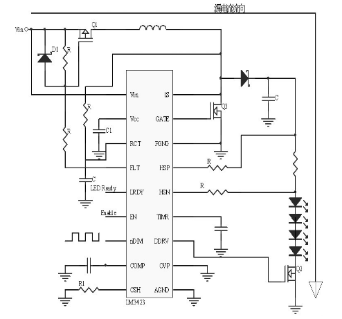 美國國家半導體研發(fā)的LM3423 芯片輸入電壓范圍在4.5V 到75V之間,適用于極寬的輸入電壓范圍;50KHZ 的快速PWM調(diào)光;內(nèi)部基準電壓50mV- 1.25V;工作頻率最大可達到1MHZ;內(nèi)部驅(qū)動能力750mA,超低電流停機小于2uA.可以用來配置升壓、浮動降壓、浮動降壓/ 升壓和SEPIC 拓撲結(jié)構(gòu)中低側(cè)外部MOSFET的控制器;使用峰值電流模式控制器和預(yù)測性關(guān)閉時間設(shè)計來調(diào)節(jié)LED 電流,峰值電流模式控制器與預(yù)測性關(guān)閉時間設(shè)計的組合簡化了回路補償設(shè)計,同時提供內(nèi)在的輸入電壓前饋補償;設(shè)有用于控制外部調(diào)光FET 和系統(tǒng)"零電流"關(guān)閉特點的集成驅(qū)動器;并且具有LED 狀態(tài)輸出標記、故障標記、可編程故障計時器和邏輯針腳,用于控制調(diào)光驅(qū)動器的極性。