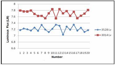 為了保證可對(duì)比性,采用相同的物料(相同的芯片、固晶膠、金線、硅膠、熒光粉,)分別對(duì)3528 LED及3014LED進(jìn)行封裝,制作色溫、色坐標(biāo)相近的LED燈珠,以便更好的進(jìn)行亮度、光衰及色坐標(biāo)等光學(xué)特性的比較分析。