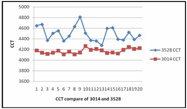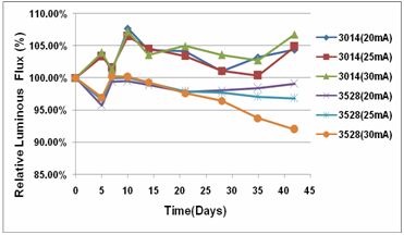 初始參數(shù)測(cè)試結(jié)果表明,在20mA電流驅(qū)動(dòng)下,3014LED的光通量比3528高,且其CCT集中度比3528LED好。另3014一般在30mA電流下驅(qū)動(dòng)使用,其光通量達(dá)到10~11Lm;如上節(jié)熱模擬顯示,3528LED散熱效果遠(yuǎn)不如3014LED,故其在大電流驅(qū)動(dòng)下,光通量必定會(huì)嚴(yán)重受到過高熱量的影響。因此相比水平散熱LED,垂直散熱LED具有不可比擬的優(yōu)勢(shì)。