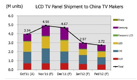 就總體液晶電視面板出貨而言, 預估向中國大陸本土廠商11月出貨量較上月成長24%, 12月較11月下降5%; 而到2012年1月, 面板出貨數(shù)量將大幅度下滑至不足300萬片, 較12月下降達到36%。
