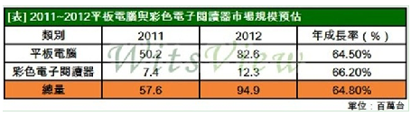 整體而言, WitsView 認為 2012年平板電腦的發(fā)展基調(diào)將偏向樂觀,預(yù)估平板電腦本身的需求達8,260萬臺,彩色電子閱讀器方面則為1,230萬臺,兩者合計的市場規(guī)模將從今年的5,760萬臺攀升至9,490萬臺,年成長率高達65%。