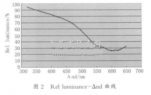采用本試驗總結(jié)出的以上Rel luminance- Δnd曲線,對于某一未知光程差的VA 液晶顯示器,只需簡單測試出高壓光電曲線,得出高壓顯示亮度與最大值顯示亮度的比值,然后對照圖2 所示的曲線,就可準確得出相應(yīng)的光程差值。