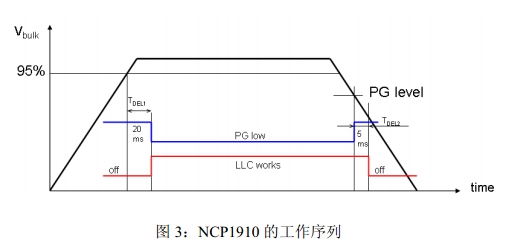 NCP1910的工作序列如圖3所示,如果PFC未就緒,LLC就不能啟動(dòng);一旦PFC就緒,就會(huì)開始一段20ms的延遲;延遲結(jié)束后PGout引腳假定為低電平,LLC可以開始工作。在撥除交流輸入關(guān)閉電源時(shí)Vbulk降低,到達(dá)PG信號(hào)時(shí),PGout引腳被釋放(開路);如果Vbulk到達(dá)LLC停止電平,LLC停止工作;或者如果Vbulk緩慢下降,如處在輕載狀態(tài),LLC會(huì)在PGout引腳被釋放5ms后停止工作。