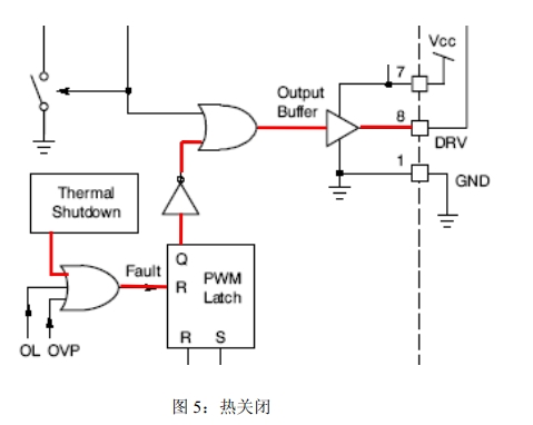 熱關(guān)閉(TSD):過熱保護(hù)功能有助于實(shí)現(xiàn)良好的電源設(shè)計(jì)。當(dāng)結(jié)點(diǎn)溫度超過140℃時(shí),該功能激活,驅(qū)動(dòng)器變?yōu)榈碗娖?;結(jié)點(diǎn)溫度降到典型值30℃時(shí)器件恢復(fù)工作。
